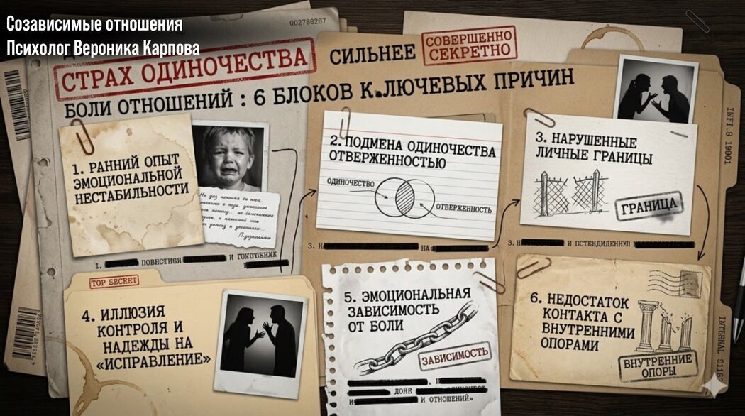 Ранние травмы эмоциональной нестабильности: Парализующий страх часто уходит корнями в детство. Если взрослые были непредсказуемыми, это формирует у ребёнка убеждение, что он не сможет выжить без поддержки другого человека.Подмена одиночества отверженностью: Многие ошибочно связывают физическое одиночество с полной незначимостью. Это приводит к тому, что они готовы терпеть любые условия в отношениях, лишь бы не столкнуться с чувством ненужности.Нарушенные личные границы: В созависимых союзах личные границы теряются. Женщины начинают свою идентичность строить на основе отношений, что приводит к потере чувства собственного «я» и ведёт к?илу потери себя.Путь к исцелению