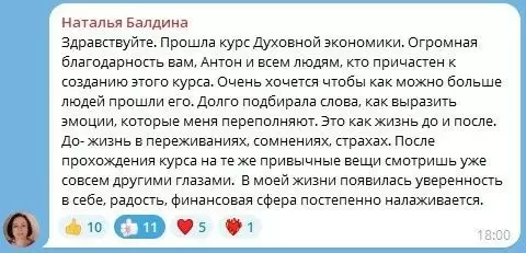 Духовная экономика сыграла ключевую роль в преобразовании жизни Натальи Балдиной. Пройдя курс, она ощутила значительные перемены, отчетливо разделив свою жизнь на "до" и "после". Этот курс стал для неё не просто обучением, а своеобразным откровением.