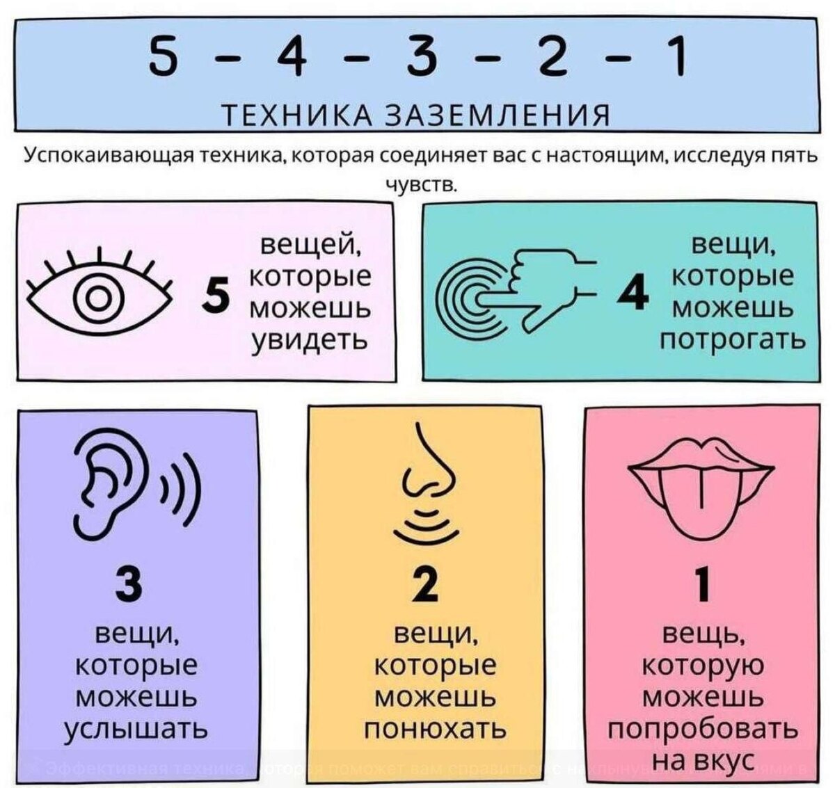 Этот метод задействует различные органы чувств, что помогает «перегрузить» мыслительный процесс и вернуть контроль над ситуацией.