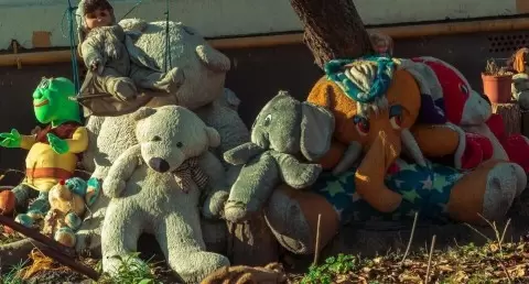 Этот двор находится на проезжей части, где каждый день проходят сотни людей по пути к остановке общественного транспорта и крупному торговому центру. Жители заметили, что после дождя и снега яркие фигуры розовых медведей, единорогов и тюленей приобретают непривлекательный вид.