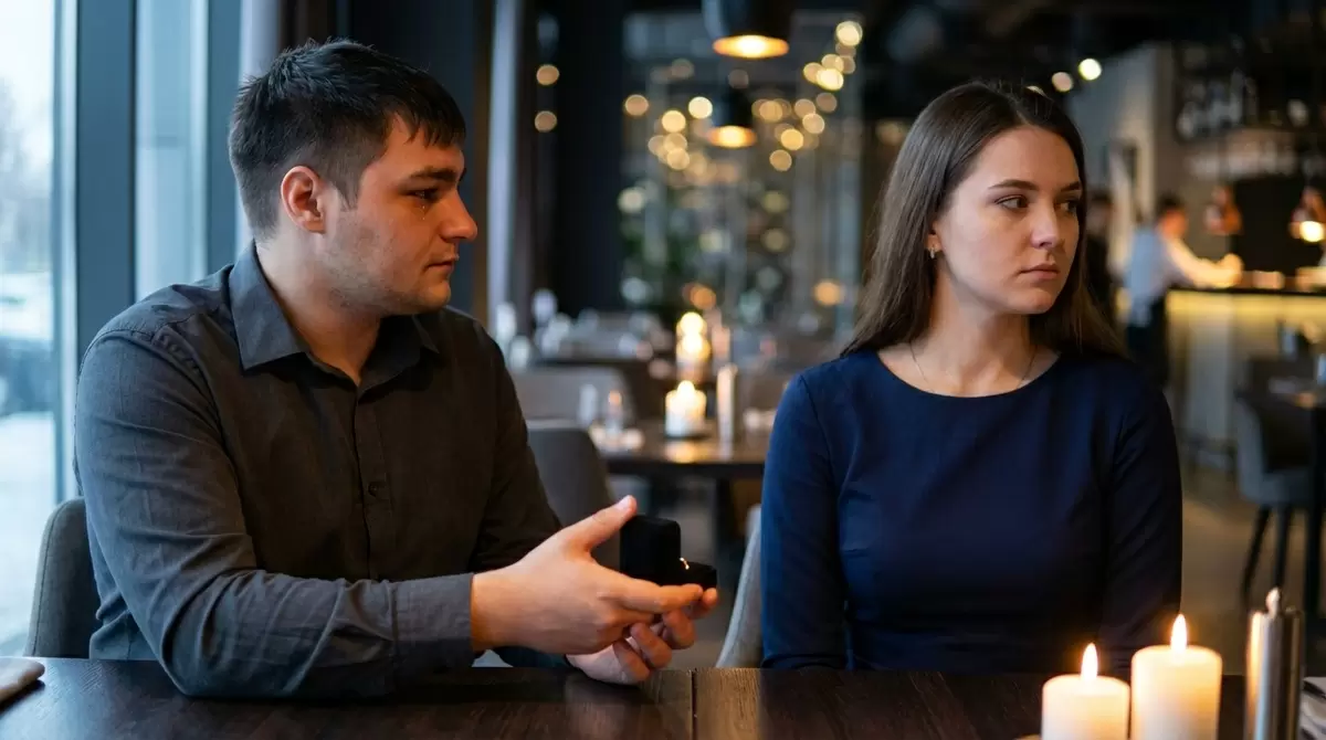 Сначала она удивилась. Затем, когда увидела кольцо, её лицо изменилось. "С таким дешёвым кольцом предложения не делают", — произнесла она, и это было достаточно громко, чтобы привлечь внимание за соседним столиком.