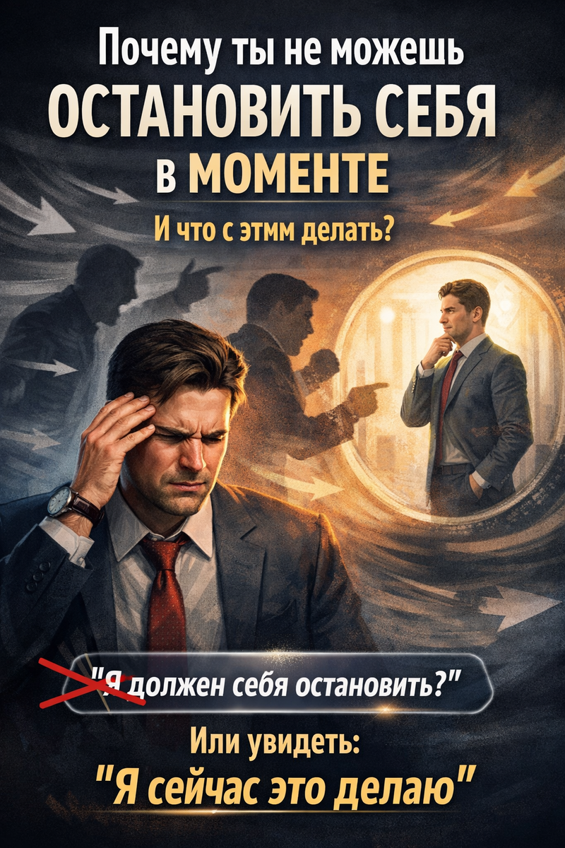 Ключевым моментом является осознание того, что не нужно пытаться «остановить себя». Вместо этого стоит научиться осознавать свои действия. Это принципиально отличается от установки «я не должен так делать». Гораздо полезнее сказать себе: «Я в данный момент именно так себя веду». В этот момент появляются новые возможности — автоматизм становится видимым, а значит, появляется и выбор.